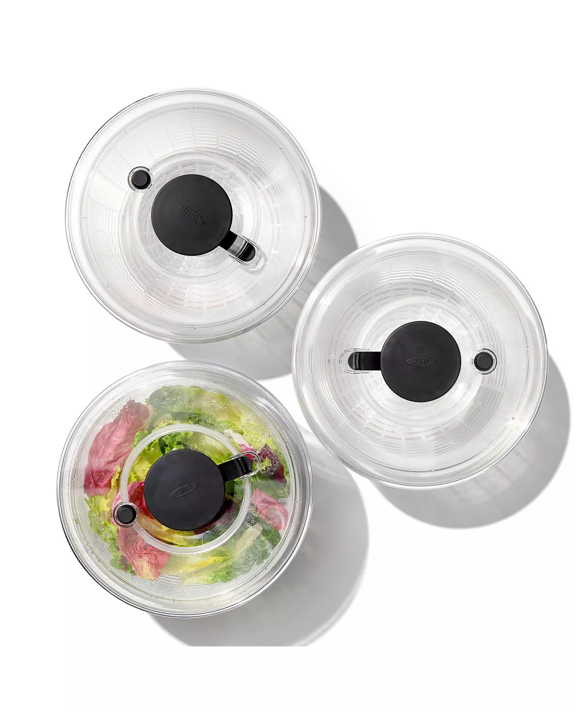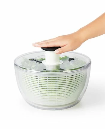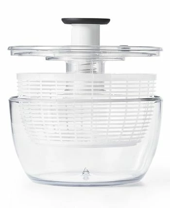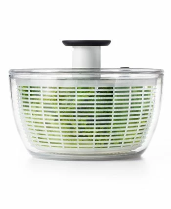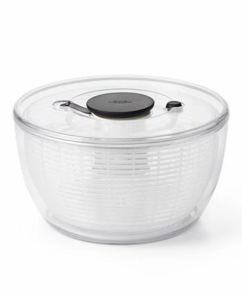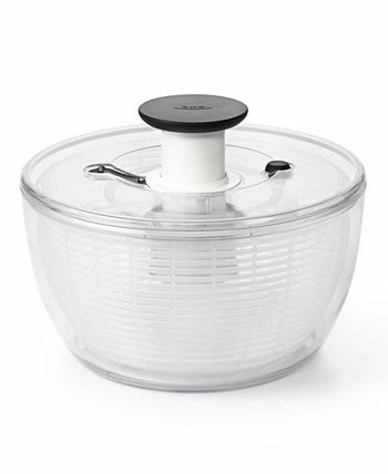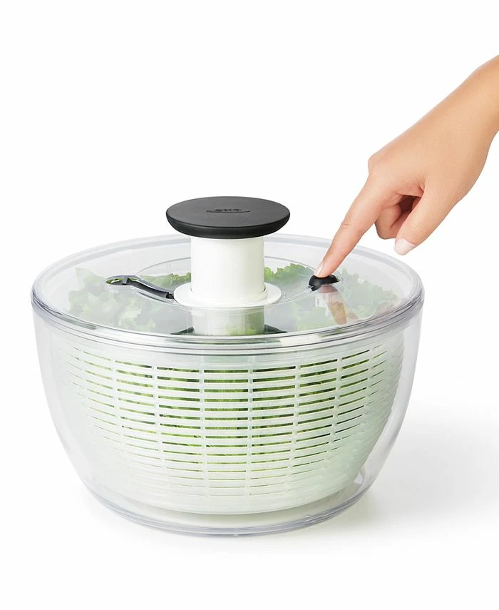 The OXO Good Grips Salad Spinner is the quick and easy way to dry greens or herbs. For clean, dry ingredients, just press the soft, non-slip knob. The spinning basket doubles as a colander, so you can rinse lettuce and more with ease. The non-slip base prevents skidding, and the patented built-in brake button stops the Spinner on a dime for unloading. Toss and serve your salad right in the bowl: The durable dish is crystal clear and moves seamlessly to the table. Simply slide the lock to hold the pump flush with the lid for compact storage. The lid comes apart for thorough cleaning. Bowl capacity is 6.22 qt/5.89 L; basket capacity is 4.95 qt/4.68 L. Dishwasher safe.