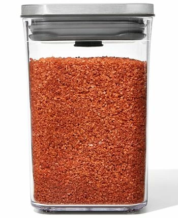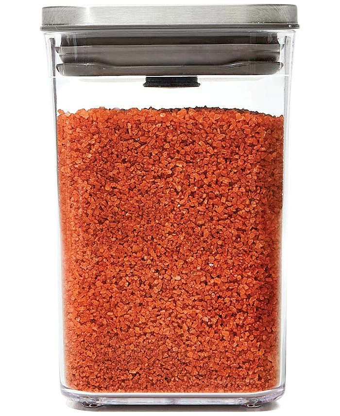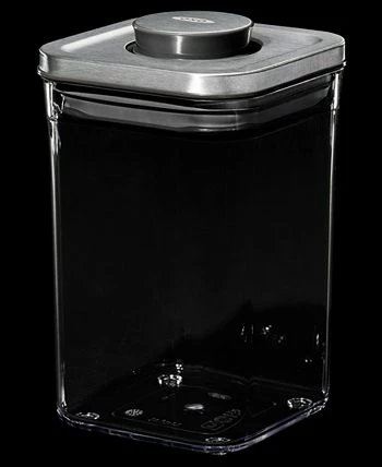Store dry foods and other items in sleek style with OXO’s Steel Pop small square short container, featuring stainless steel lid accents for a decidedly modern look. Easy open push-button lid creates an airtight seal with a single press. Multiple containers can nest with their lids on for convenient, stackable storage.