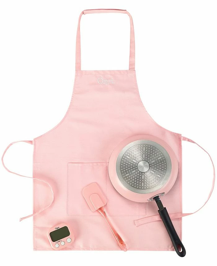 - Color-coordinated junior chef cooking set includes a 9.5″ frying pan, apron, spatula and kitchen timer