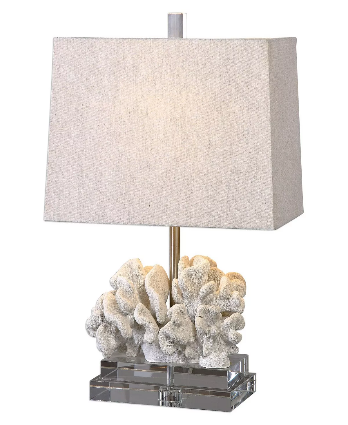 Taupe Ivory Coral Sculpture Accented With Thick Crystal Details. The Slightly Tapered Rectangle Hardback Shade Is A Beige Linen Fabric With Natural Slubbing.