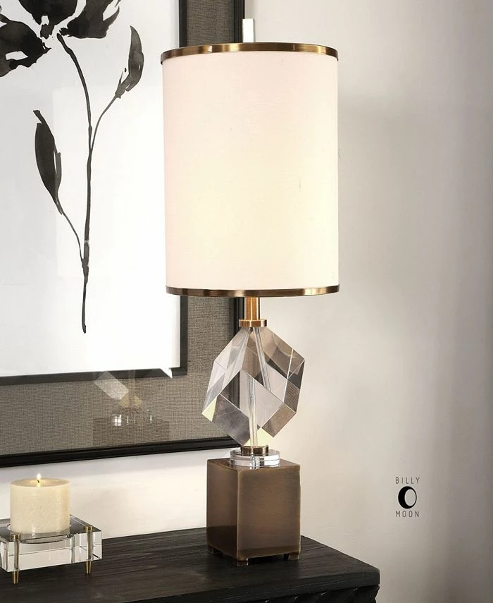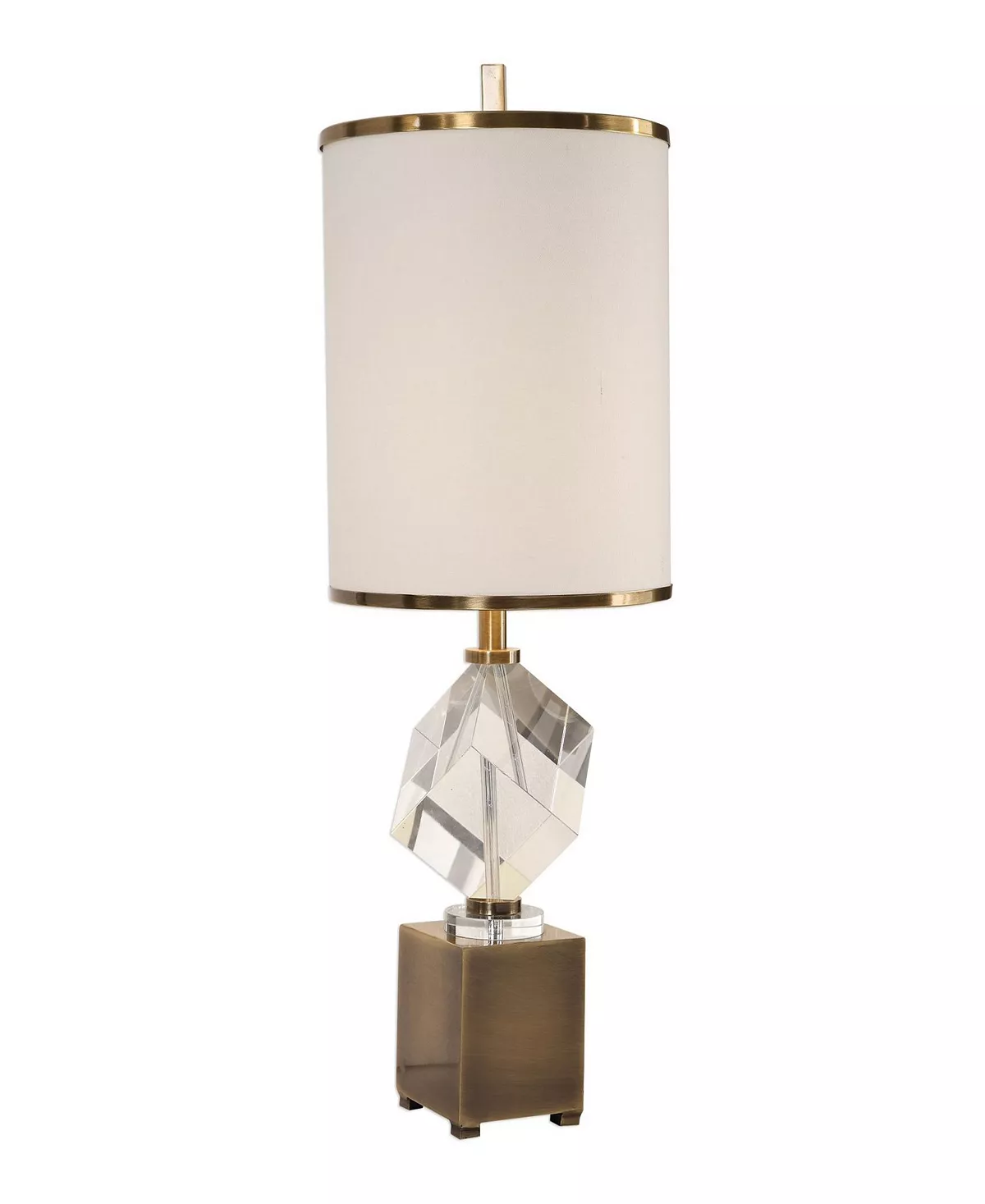 This Unique Design Features A Thick Crystal Cube, Balancing On A Crystal Disk That’s Displayed On A Chunky Steel Foot, Finished In A Plated Antique Brass. The Round Hardback Drum Shade Is A White Linen Fabric With Antique Brass Iron Trim.