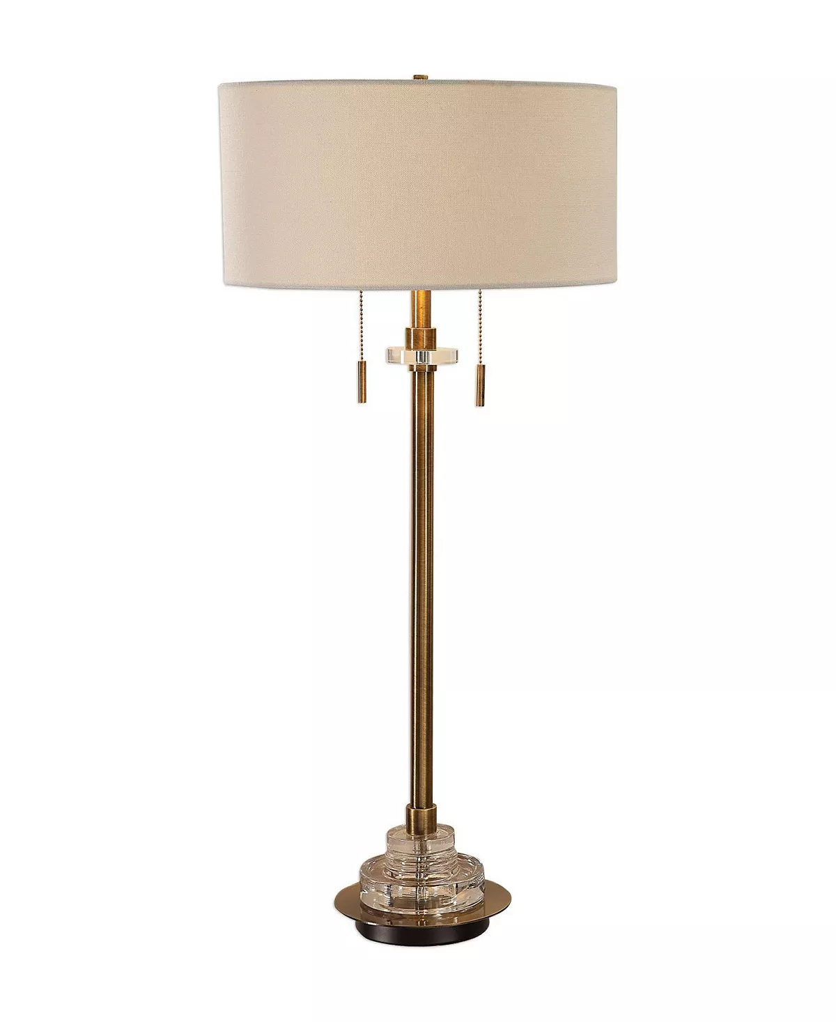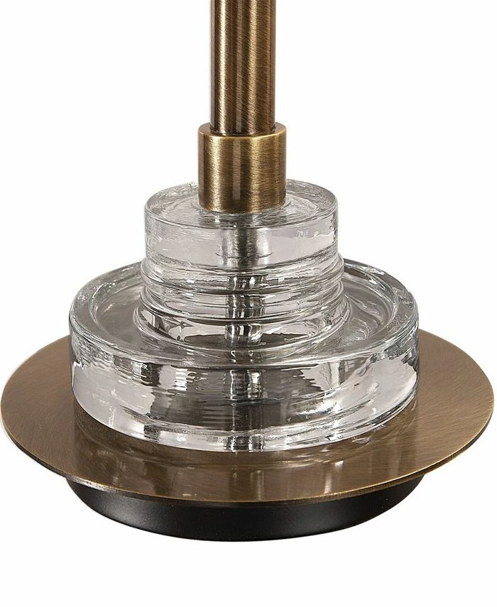 Petite Steel Column, Finished In A Plated Antique Brass, Resting On A Thick Glass Insulator, Paired With A Delicate Crystal Accent. The Round Hardback Drum Shade Is A White Linen Fabric With Natural Slubbing.