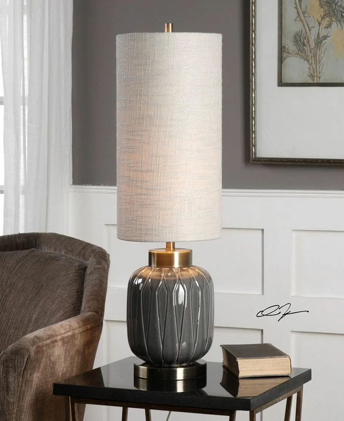 Aged Gray Ceramic, Featuring An Embossed Decorative Design, Accented With Heavily Antiqued Brass Plated Details. The Tall, Round Hardback Shade Is A Light Khaki Linen Fabric With Heavy Slubbing. Due To The Nature Of Fired Glazes On Ceramic Lamps, Finishes Will Vary Slightly.