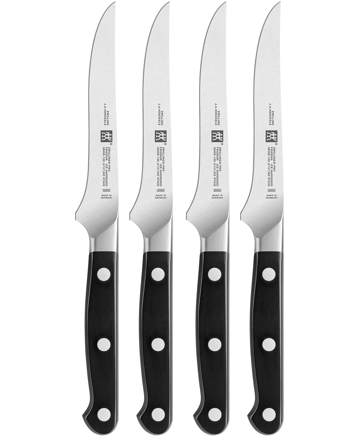 Crafted for comfort, ease and precision results, the unique blade and ergonomic bolster designs of this steak knife set make it easy to prep like a pro. An innovative blade shape offers full edge utility and reduces stress on your wrist, while the unbeatable Zwilling special formula steel construction guarantees year after year of exceptional use. Lifetime warranty.